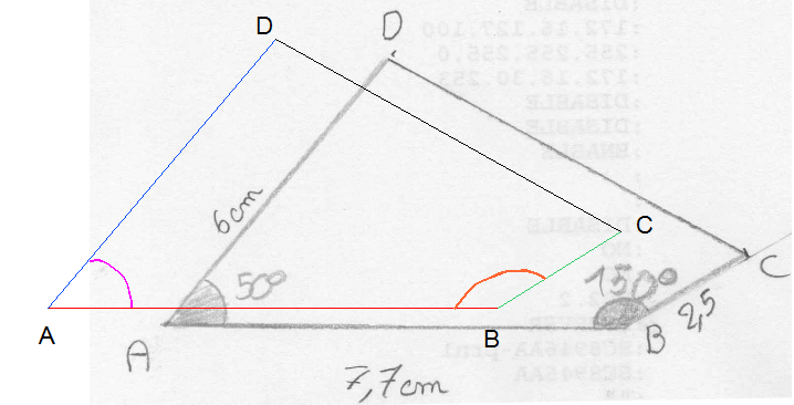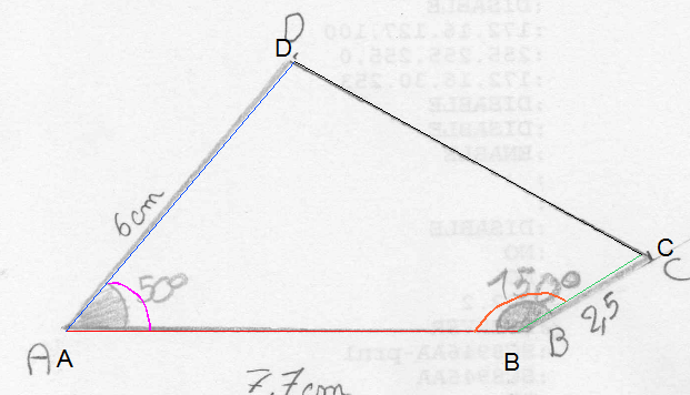 - L'élève A reçoit la figure du professeur (annexe 1 ) , mesure 3 segments et 2 angles ( des couleurs permettent d'éviter les confusions qui empêcheraient d'évaluer correctement l'objectif de cette séance ) puis il construit une figure à main levée en y indiquant les longueurs mesurées et les angles mesurés. (consignes en annexe 2).