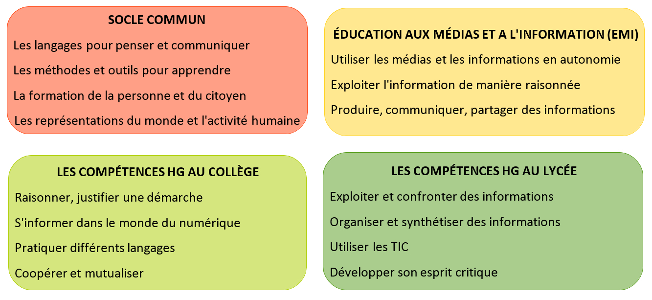 Depuis la rentrée 2016 est introduite une compétence « S’informer dans le monde du numérique », spécifique à l’histoire et à la géographie, qui s’ajoute aux autres compétences déjà présentes dans les anciens programmes (se repérer dans le temps, dans l’espace, pratiquer différents langages … ). Cette compétence se décline en différentes capacités et est présente en cycle 3 comme en cycle 4. Comment apprendre à s’informer dans le monde du numérique ? C’est-à-dire, quelles capacités mettre en œuvre pour construire une véritable pratique de l’information, propre à l’histoire et à la géographie ? Quels outils mettre en place pour évaluer la maîtrise de cette compétence et la progressivité de celle-ci sur les cycles 3 et 4. Quelle continuité avec le lycée général, technologique et professionnel ?