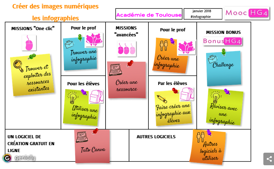 Si nous avons souligné qu'il n'était nullement nécessaire d'être un expert en informatique pour mettre en œuvre une séance numérique en classe, il peut être intéressant de s'approprier en amont l'outil. On sera alors plus à l'aise pour accompagner les élèves, mais également plus à même de découvrir de nouvelles possibilités. On ne saurait trop conseiller aux collègues intéressés par les langages graphiques en général, les infographies en particulier les travaux de l'académie de Toulouse, menés dans le cadre des TRAAM 2016-2017et avec le MOOC HG4. Pour les premiers, on trouvera notamment d'autres exemples de mise en œuvre, la fiche d'évaluation du logiciel CANVA et leur bilan académique. Pour le second, on trouvera des missions simples et d'autres plus avancées, pour les élèves comme pour les enseignants. On pourra aussi comparer les différents outils pour créer des infographies.
