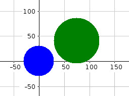 Dans une fenêtre carrée, deux disques, l’un bleu et l’autre vert, sont placés aléatoirement et on voudrait savoir si les collisions sont fréquentes, c’est-à-dire si les deux disques se chevauchent souvent.