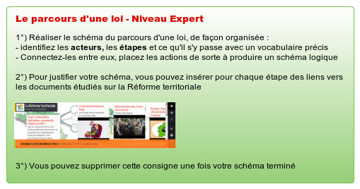 - le dossier documentaire sur la réforme territoriale serait ensuite mis en parallèle du schéma réalisé par les élèves. Par un système de capture d'écran et d'hyperlien, les élèves pourraient alors intégrer les différentes étapes présentées dans le dossier documentaire à leur schéma. = validation de l'hypothèse / écart au modèle