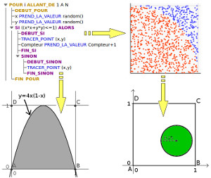 On donne un algorithme complet à l'élève qui doit comprendre son fonctionnement. Il exécute ensuite le programme fourni et établit le lien entre les fréquences calculées par le programme et un quotient d'aires. On demande ensuite à l'élève d'utiliser cet algorithme pour estimer une probabilité dans une expérience aléatoire similaire et une aire complexe.