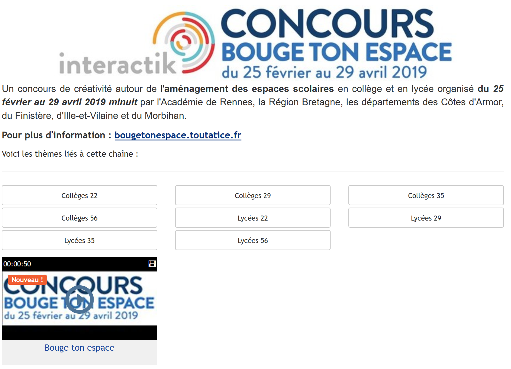 Après vous être connecté avec votre identifiant Toutatice, vous pourrez déposer la vidéo de présentation de votre projet et les documents associés dans la catégorie dans laquelle vous concourez.