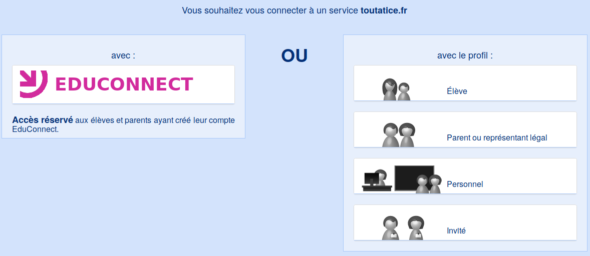 Vous accédez alors au "service découverte" ci-dessous. Si vous possédez un compte EduConnect, vous pouvez vous connecter en cliquant sur le bouton situé à gauche. Dans le cas contraire vous devez choisir un profil parmi la liste proposée sur la droite.