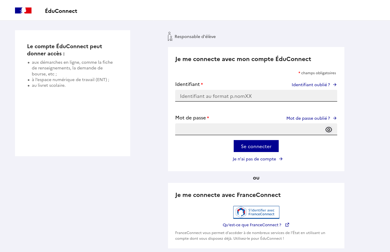 • si vous êtes élève ou responsable d’élève et utilisez un compte ÉduConnect ou ÉducAgri, merci de vous rapprocher de votre établissement ;