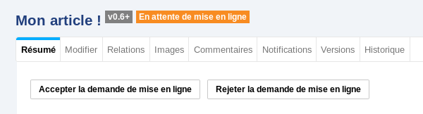 Vous pouvez consulter l'article dans l'onglet Résumé, et éventuellement lui apporter des modifications dans l'onglet Modifier. Cliquez sur le bouton <Accepter la demande de mise en ligne> pour publier l'article et le rendre ainsi disponible à tout internaute se rendant sur la plateforme.