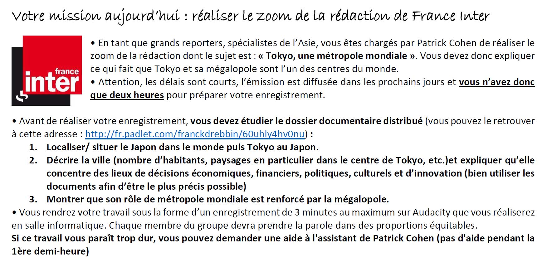• Ajouter une fiche méthode sur les exigences « techniques » d'un reportage radio : ne pas lire ses notes, parler lentement et distinctement, etc.