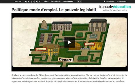 1/2 h : Les élèves visionnent à leur rythme une vidéo « Politique, mode d'emploi » leur décrivant le parcours d'une loi http://education.francetv.fr/videos/politique-mode-d-emploi-le-pouvoir-legislatif-v111005 . Ils peuvent prendre des notes.