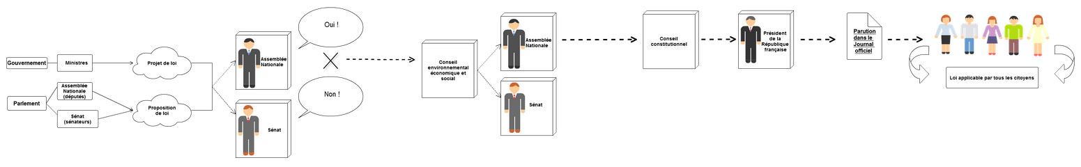 - Si c'est le premier schéma que l'on fait réaliser en classe, donner une consigne ouverte « réaliser un schéma expliquant l'élaboration d'une loi » pour qu'émerge la compréhension des étapes par chacun, quel que soit son niveau.