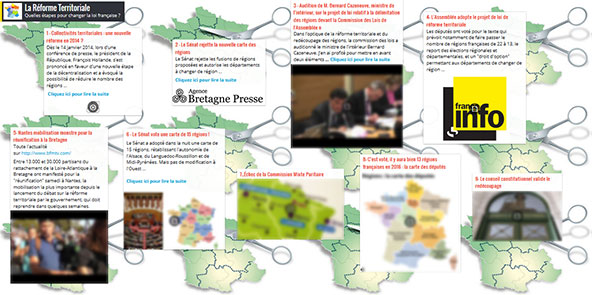 - le dossier documentaire sur la réforme territoriale serait ensuite mis en parallèle du schéma réalisé par les élèves. Par un système de capture d'écran et d'hyperlien, les élèves pourraient alors intégrer les différentes étapes présentées dans le dossier documentaire à leur schéma. = validation de l'hypothèse / écart au modèle