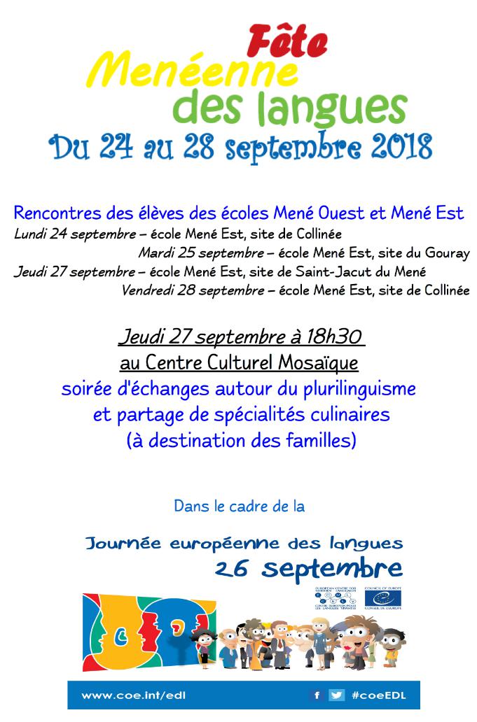 Des rencontres entre les élèves de 23 classes des écoles Mené Ouest et Mené Est ont eu lieu tout au long de la semaine. Le Jeudi 27 septembre, au Centre Culturel Mosaïque, s'est tenue une soirée d’échanges autour du plurilinguisme.