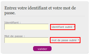- Sur la page d'authentification, vous pouvez cliquer sur les liens <identifiant oublié ?> ou <mot de passe oublié ?>