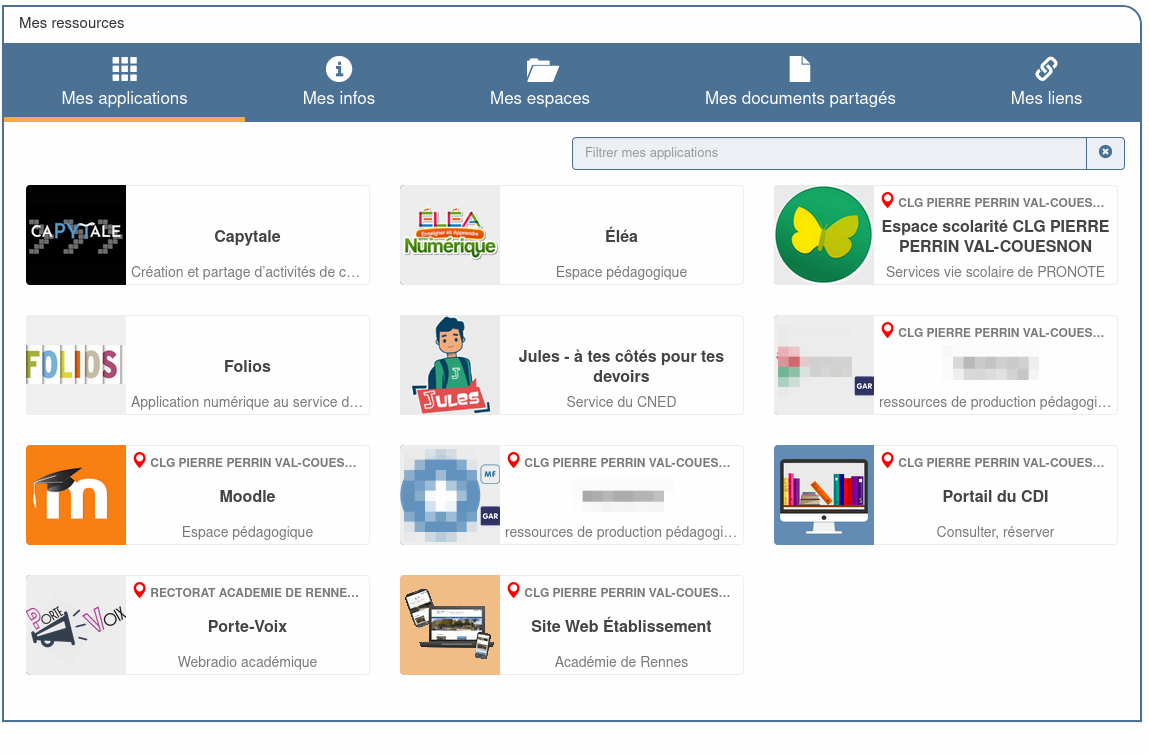 Pour mieux accueillir les élèves sur Toutatice (des collèges, EREA et lycées publics, dans un premier temps), leur bureau - qui est leur page d'accueil, donnant accès à toutes leurs applications et ressources numériques - a été amélioré pour cette rentrée 2023. Les élèves retrouvent maintenant leurs applications Toutatice et leurs ressources numériques GAR au même endroit, rangées dans l'ordre alphabétique de leur titre ; un filtre permet de retrouver rapidement l'application recherchée en saisissant trois ou quatre caractères :
