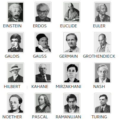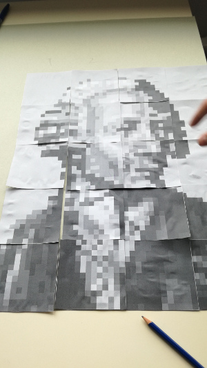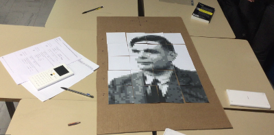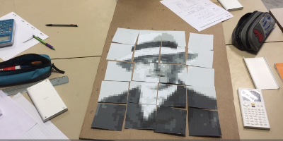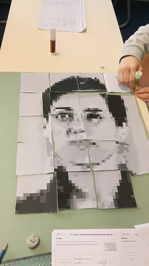 On partage la classe en plusieurs groupes (maximum de 6 personnes par groupe). Les situations proposées sont identiques aux groupes mais les puzzles sont différents pour ainsi obtenir à la fin de la séance plusieurs portraits pixellisés de mathématiciens.