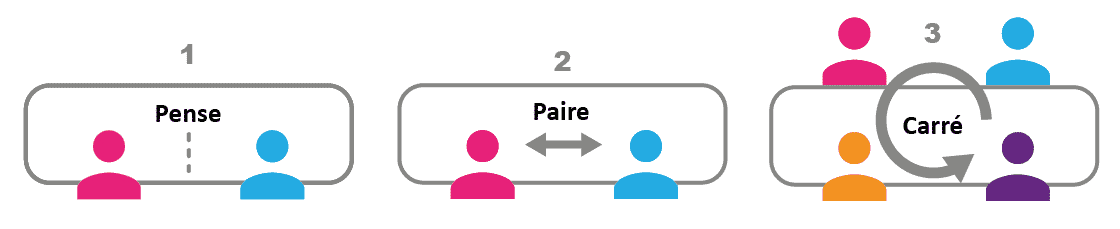 • le pense, paire, carré : seul, à deux, à quatre : très facile à mettre en oeuvre. Ce dispositif permet de concentrer l'élève dans sa tâche par des lectures et du travail individuel ("Pense"). Puis l'élève peut comparer son travail avec son voisin ("Paire"). Il s'agit déjà d'une forme de travail de groupe. Les deux élèves comparent leurs réponses, analysent leurs productions au regard de critère de réussite qu'ils définissent ensemble ou que le professeur distribue. Chacun négocie, justifie et défend éventuellement ses réponses.