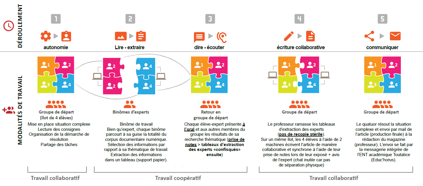 Un exemple concret : Une séquence en jigsaw détaillée dans le scénario pédagogique suivant (cf. partie Animation pédagogique) : Hypermédia et moments numériques pour comprendre un espace productif en 3e