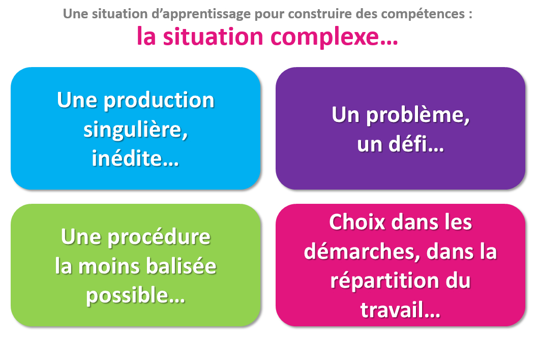 Une situation complexe, dont la contextualisation peut être disciplinaire ou non, renvoie au caractère global et transversal de la compétence. On parle également de « construire une réponse adaptée » : la compétence ne s’apprend pas, mais se construit (on ne « révise » pas une compétence). En conséquence, cela nécessite que l’élève ne soit pas placé en position d’exécutant d’une succession de tâches simples : l’autonomie de réflexion qui est recherchée ne se traduit pas par un travail en solitude avec automatisation des tâches. Une attention nouvelle doit être portée aux processus d’apprentissage des élèves.