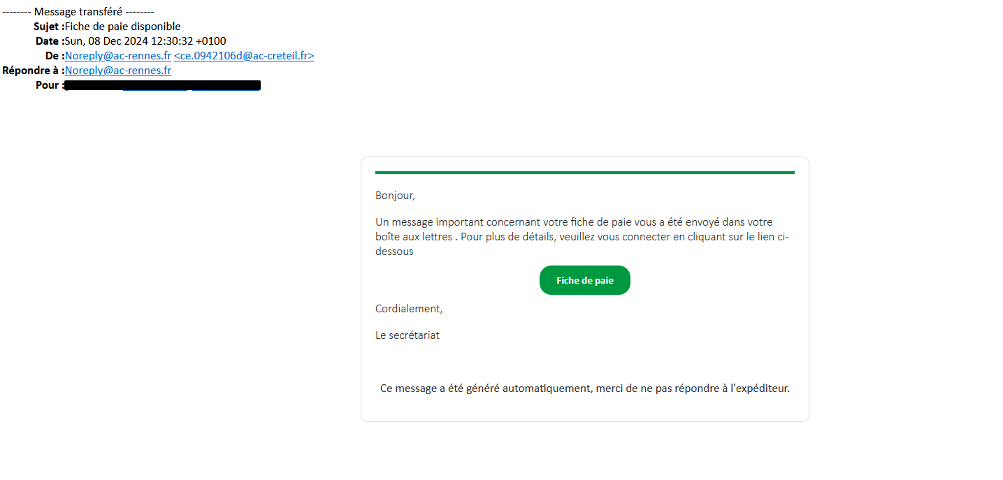 ALERTE DU 09/12/24 - Méls frauduleux concernant un message reçu à propos de votre fiche de paie.