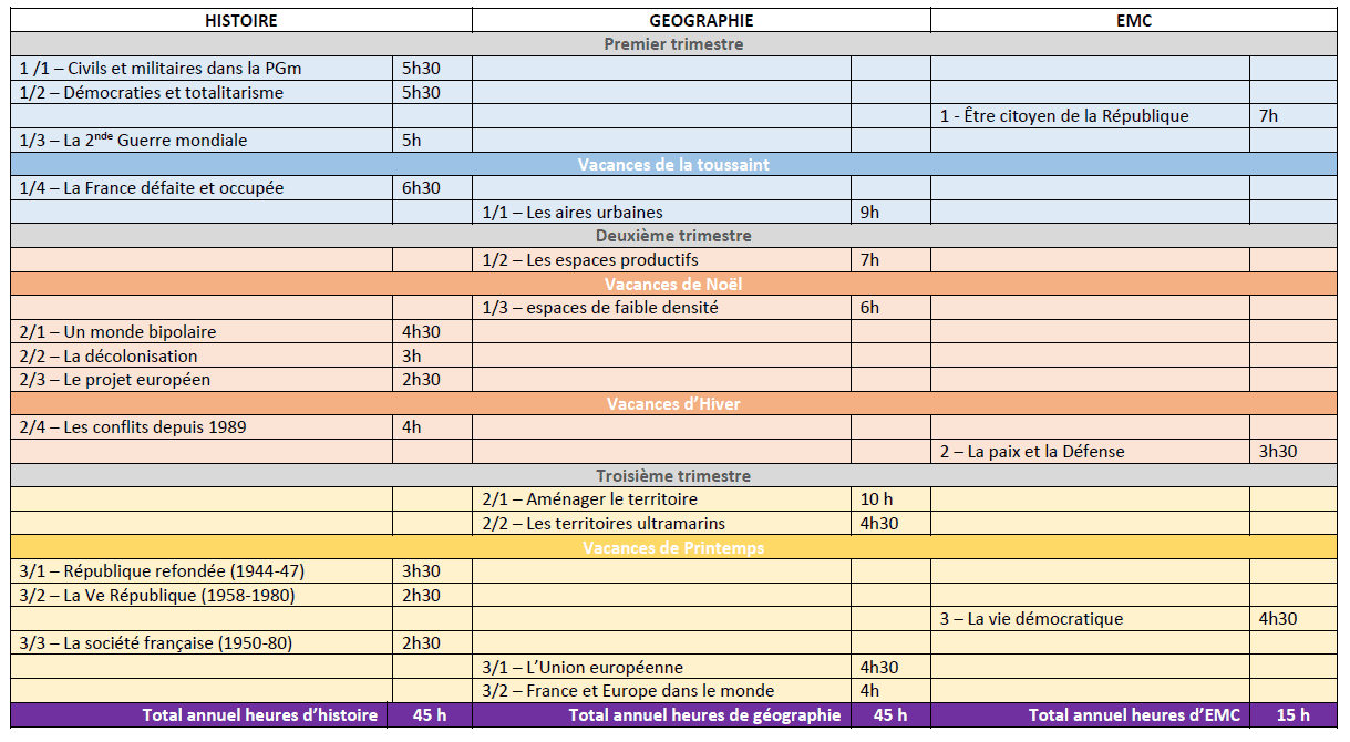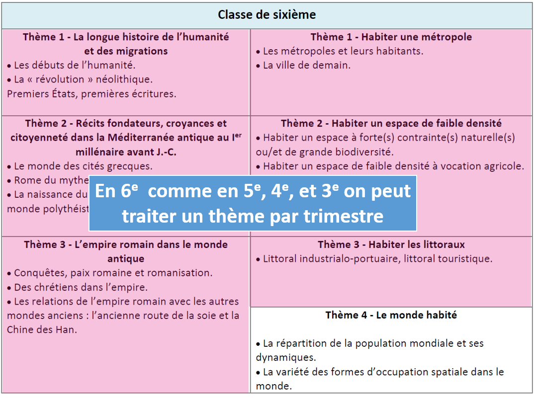 • L'idée d'un thème par trimestre est un repère de construction. Vous avez bien entendu la liberté d'accorder à un thème un volume horaire plus petit ou plus grand. On gardera seulement à l'esprit que cette comptabilité horaire doit se faire entre les thèmes d'histoire ou entre le thème de géographie. En revanche on ne peut pas donner à l'histoire en prenant à la géographie et inversement...