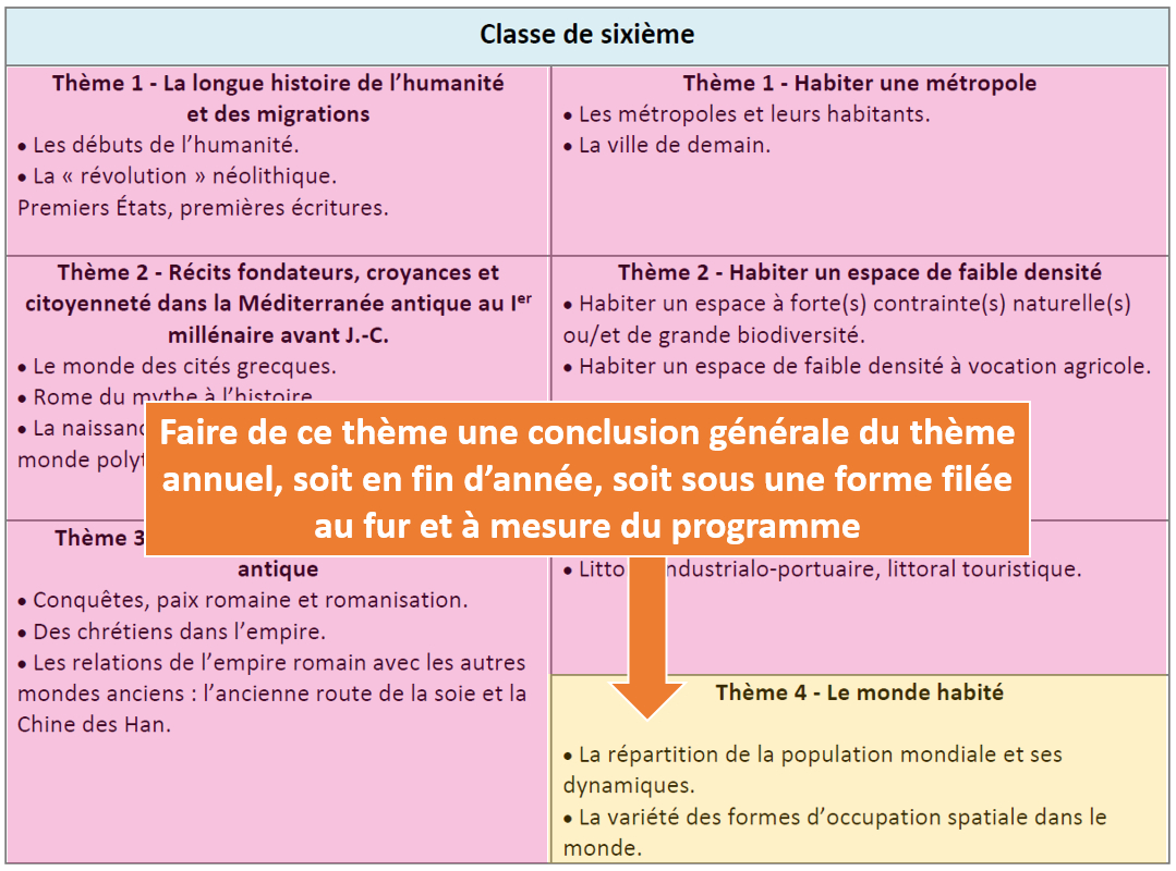 • En géographie cycle 3 : l'ordre des thèmes est libre en géographique. Le thème 4 peut être scindé et étudié de manière filée tout au long de l’année.
