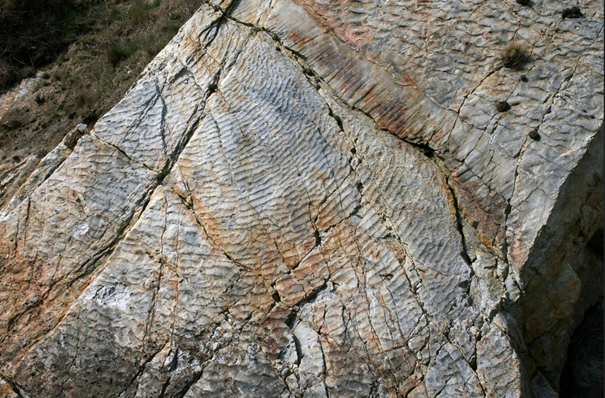 Il s’agit en fait d’un fond d’estran fossilisé avec ses rides de courant , également appelées ripple-marks. Ces traces montrent que le sédiment (du sable) à la base de ce quartzite s’est déposé dans ce qui était jadis une zone côtière peu profonde (quelques mètres) où existait un régime complexe de courants.
