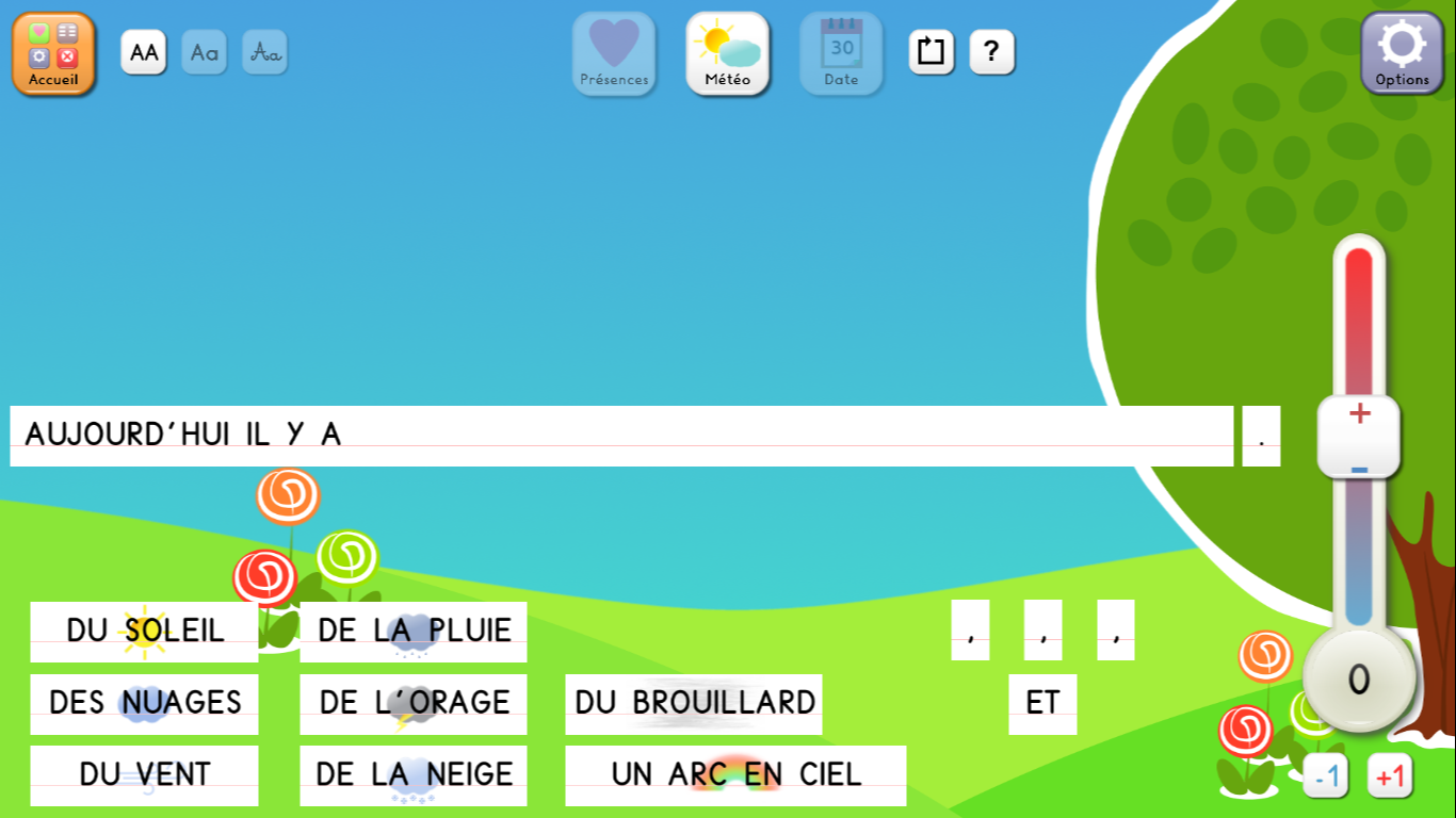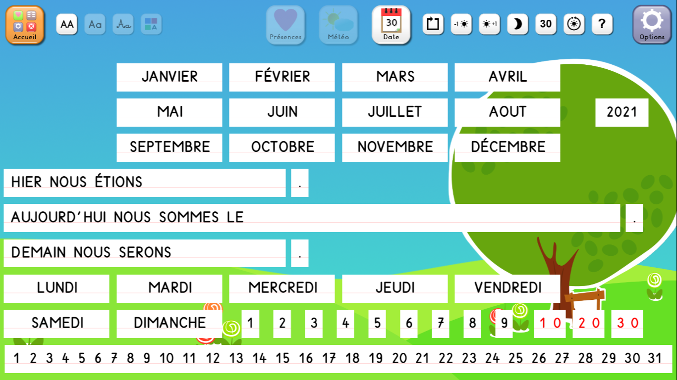 - l'éphéméride : pour afficher le jour, la date, le mois, la saison et la météo quotidienne et travailler sur les notions temporelles : hier, avant-hier, demain, après-demain.