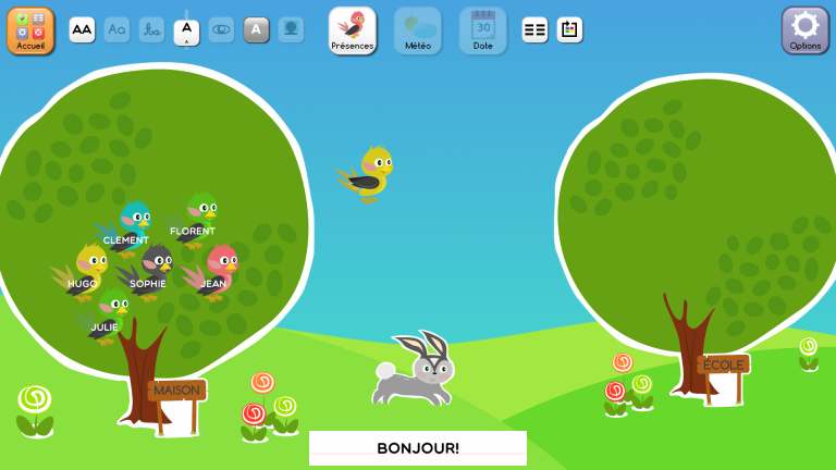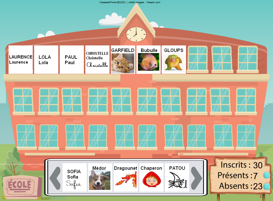 Indiquer sa présence en cliquant sur la frise des noms en bas de l'écran afin de remplir les fenêtres de l'école.