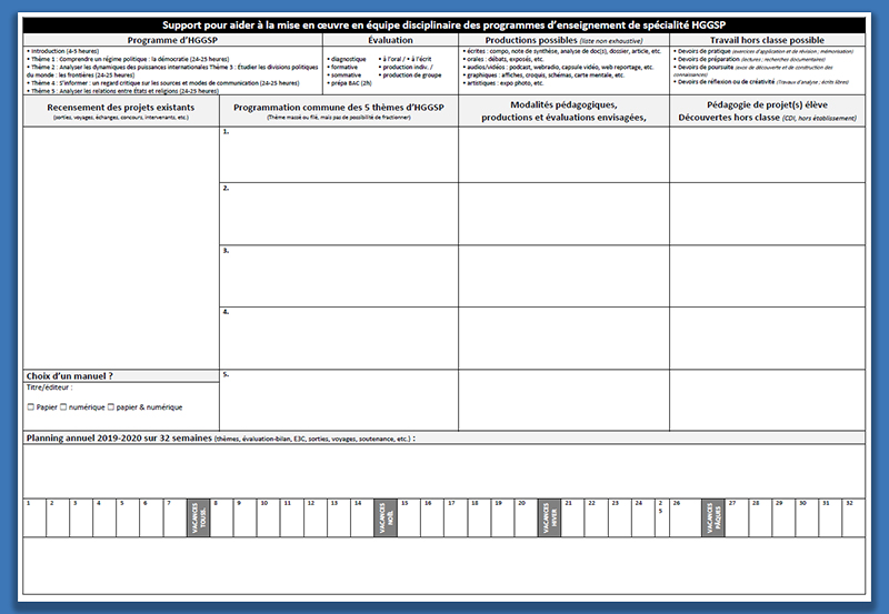 Pour tenter de faciliter le travail de préparation et de planification en équipe, nous avons souhaité réunir sur une seule feuille A3, un certain nombre d'informations à mutualiser et de décisions à acter c. Cet outil à télécharger et à exploiter librement est à envisager d'une certaine manière comme un mémento pour mettre en œuvre les nouveaux programmes d'HGGSP Première 2019. En espérant qu'il vous sera utile.
