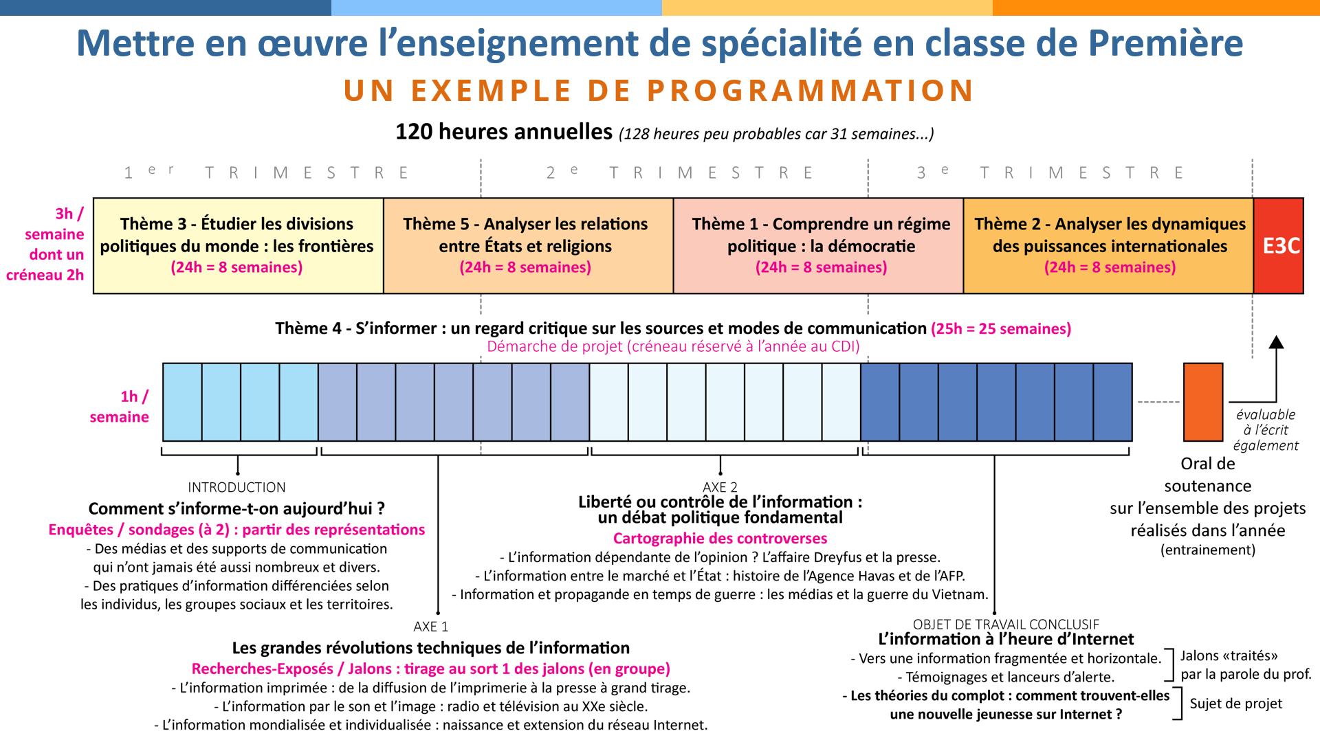 Cette proposition file sur l'année un des thèmes au programme. Nous avons sorti le thème 4 "S'informer : un regard critique sur les sources et modes d'information" pour le mettre en œuvre sur un créneau dédié d'une heure par semaine (sur 25 semaines) et pour laquelle nous avons demandé à la Direction de notre établissement de nous réserver à l'année le CDI. Comme l'invite le programme, nous travaillons en équipe sur ce thème (et les autres d'ailleurs) avec notre collègue professeur documentaliste. Les scénarios pédagogiques ne sont pas encore calés, mais d'ores et déjà nous avons déterminé des grands axes didactiques (exposés, sondages-enquêtes sur le terrain, recherches documentaires, cartographie des controverses, démarche de projet avec soutenance en fin d'année de première). En partenariat avec le CLEMI, nous profiterons de la semaine de la presse pour travailler autrement ce thème. Nous avons aussi réservé des visites de l'entreprise Ouest-France à Rennes pour découvrir l'organisation d'une presse à grand tirage. Nous souhaiterions également que les élèves prennent en charge l'organisation d'une table ronde en invitant des journalistes pour discuter de l'Axe 2 : "Liberté ou contrôle de l'information".