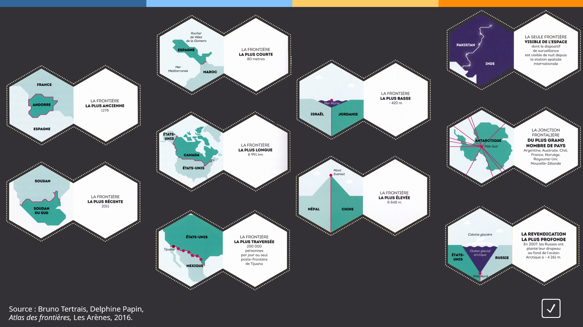Les réponses sont notamment disponibles dans l'ouvrage de Bruno Tertrais, Delphine Papin, Atlas des frontières, Les Arènes, 2016. (à acquérir dans tout bon CDI !) |
