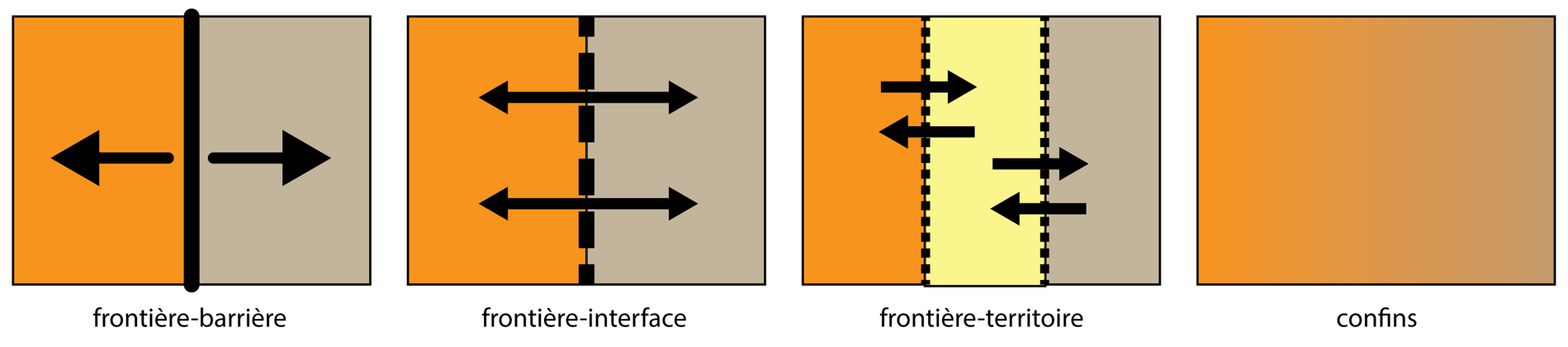 - celui d'interface, la frontière ne fait que filtrer et canaliser des relations entre espaces qui existeraient de manière plus diffuse sans elle ;
