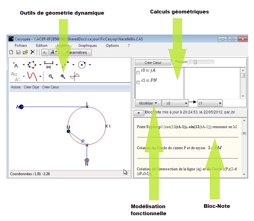 Le logiciel Casyopée dispose d'une fenêtre de géométrie dynamique permettant de construire des figures animées modélisant des dispositifs physiques à laquelle est associée un onglet permettant