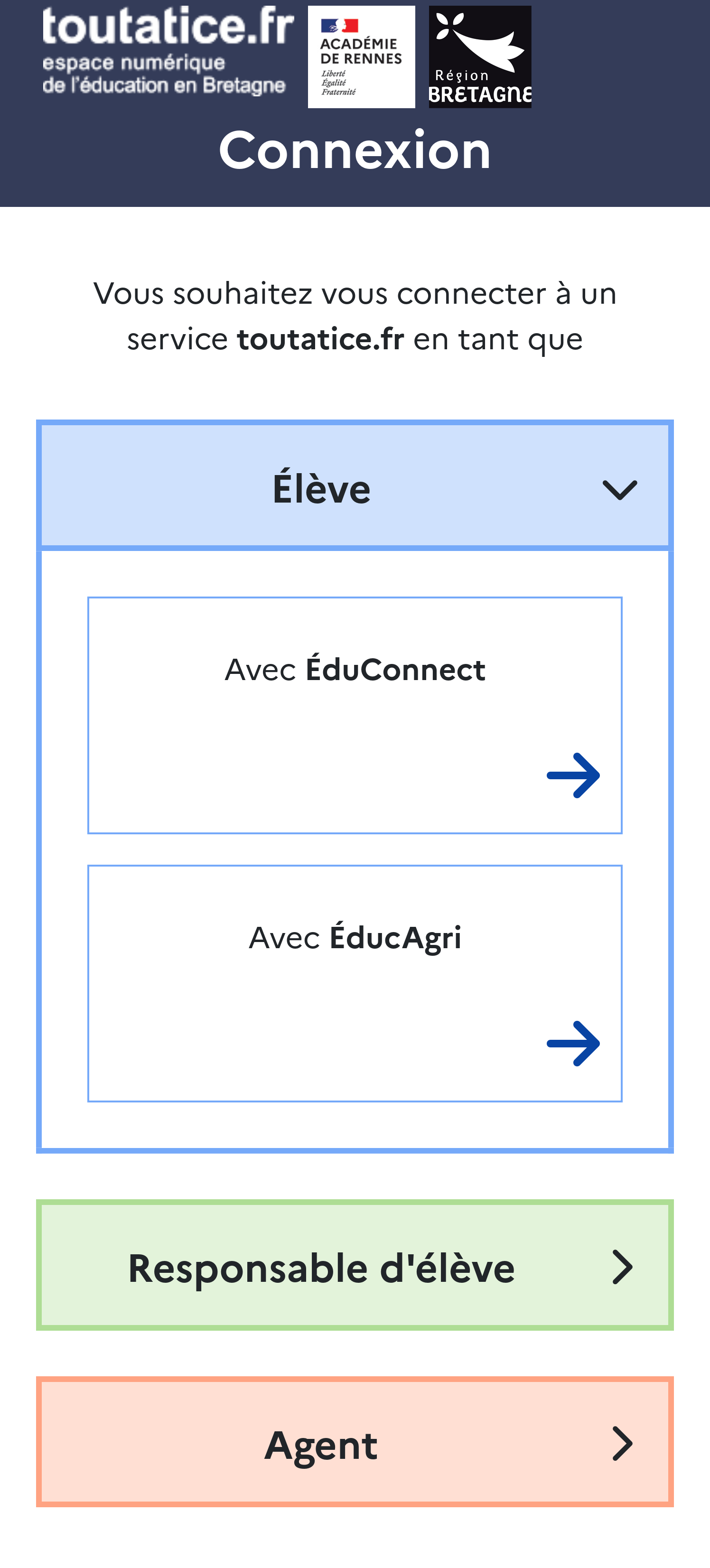 Sur téléphone, commencez pas tapoter sur votre profil (Élève / Responsable / Agent) pour ouvrir le cadre, avant de choisir entre un accès via votre compte EduConnect ou votre compte académique, ou un accès via votre compte Educagri (pour les lycées agricoles).
