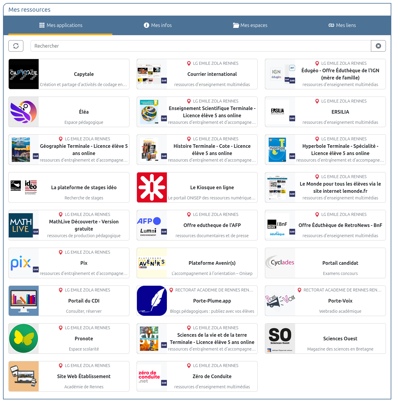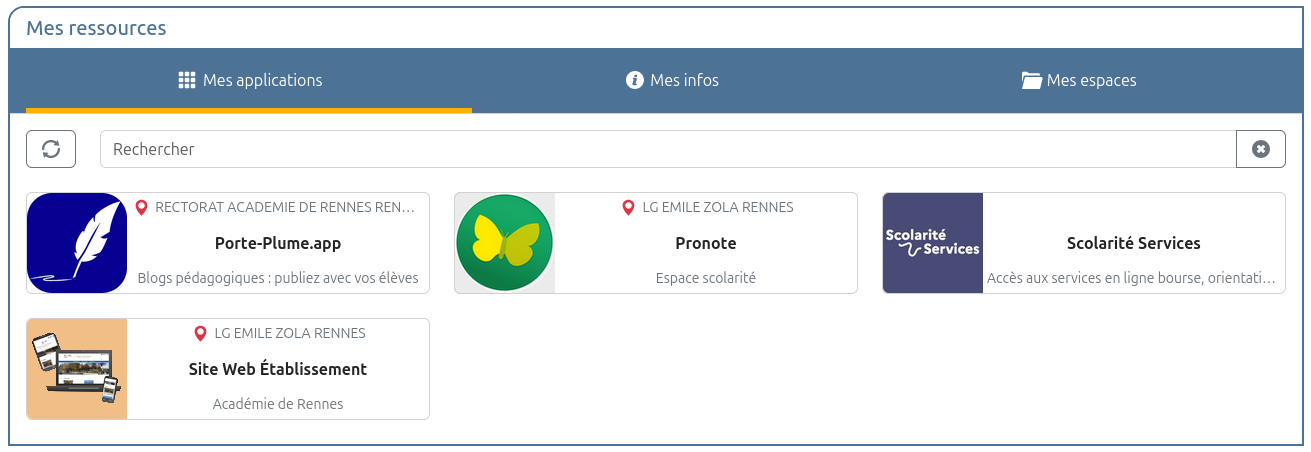 Vous accédez alors à votre bureau Toutatice, qui vous présente les informations, ressources, et accès aux applications qui vous concernent ; par exemple :